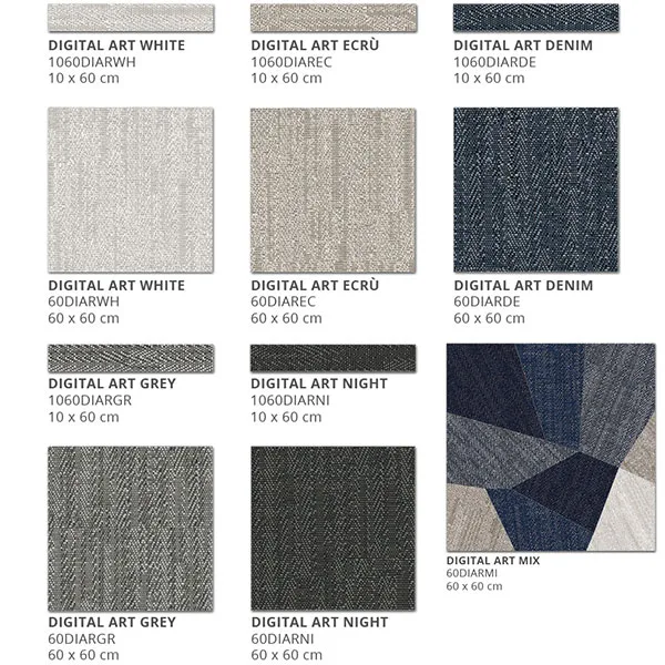 Bộ sưu tập DIGITALART bao gồm 11 sản phẩm cơ bản Kích thước: 10x60cm và 60x60cm Bề mặt: Mờ, nhám Loại: Gạch ốp tường, gạch lát nền, gạch decor trang trí